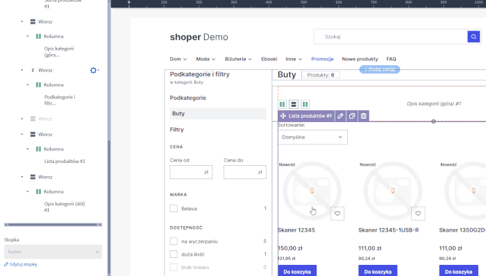 • w edytorze układu z listy „Edytowalna strona” wybierz Listy produktów -> Produkty z kategorii;